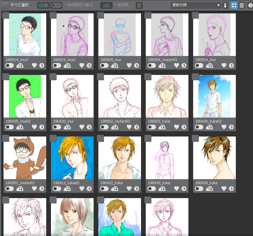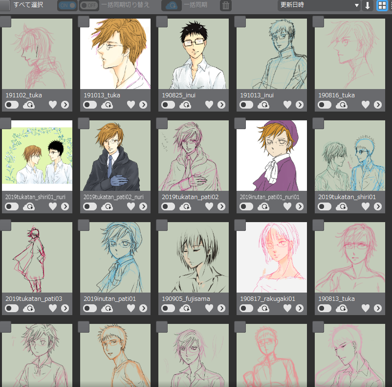 2019/11/03(日)描けないねえ 日常 今日もお絵かきソフトを立ち上げっぱなしにして、手が空くとすぐ描けるようにしていたんですけどねえ。描けませんねえ。描いては消し描いては消し…の繰り返しでちっとも形にならない。中途半端な落書きばかり増えていく。 こんな感じのが溜まっています。これはクリスタで描いた分。別なソフトで描いたものもあるので、実際はもっと沢山ため込んでいる。 同じことを文章でもやっていて、数行打ち込んで止っているものが沢山あるわけです。 これをどうにかするまではサイトはたためない(どうにかしてもたたまない気はします)。 あ、これ辛いよって話ではなく、困っちゃうねーといいつつ楽しんでますという話です。 そうなの。そこそこ楽しいの。もうちょっとちゃんと出来るともっともっと楽しいのになあって思ってます。