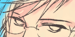 手塚の髪の毛、いつも顔とセルを分けて描いているんですけど、必ずヅラがずれるみたいなことになる。髪の毛のセルをやや左下に動かすとちょうどよくなるんですよねー。これ、描いているときはわかんないの。面白い。
