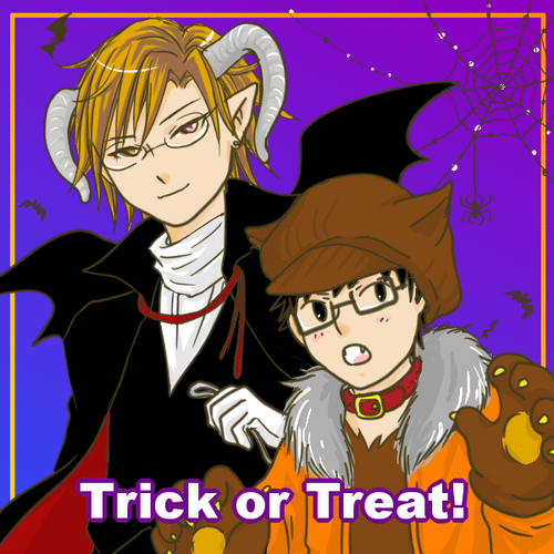 Trick or Treat! 魔界のちみっこ達もハロウィーンに繰り出しますよ。 ていうか、本場?仮装じゃなくて、真の姿? プリンスは悪魔のコスプレで、子乾は、まんま狼です。 お菓子をもらうために頑張ります。 いや、きっと一番たくさんくれるのはプリンスだと思うんだけどね。 久しぶりのお絵描き。ものすごく時間がかかったけど楽しかったです。 ペンタブの調子が悪いののは相変わらずだけど。 いつものことですが、溺れる回・遊・魚さまとシンクロしてます。 2010.10.28 |